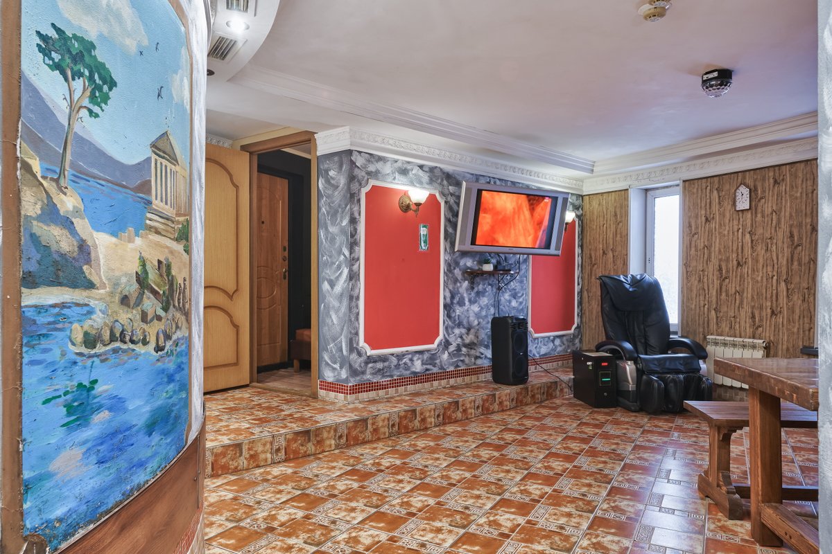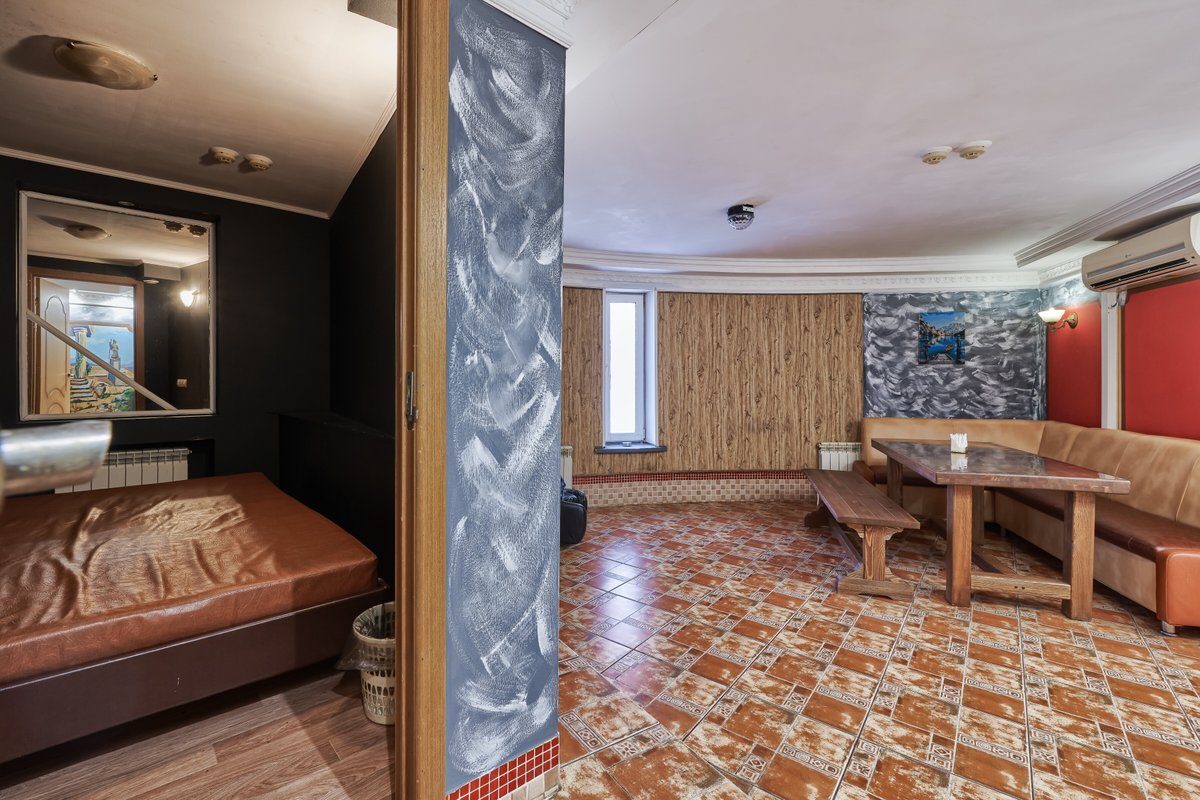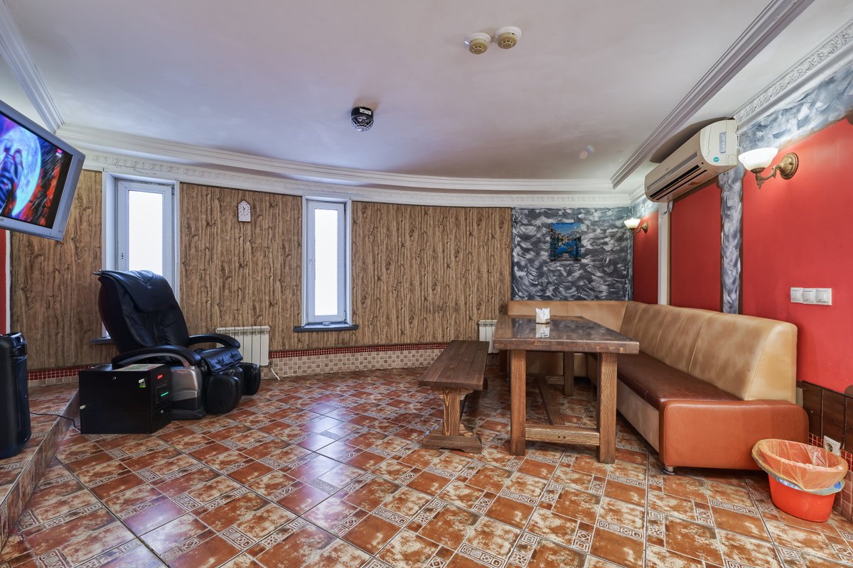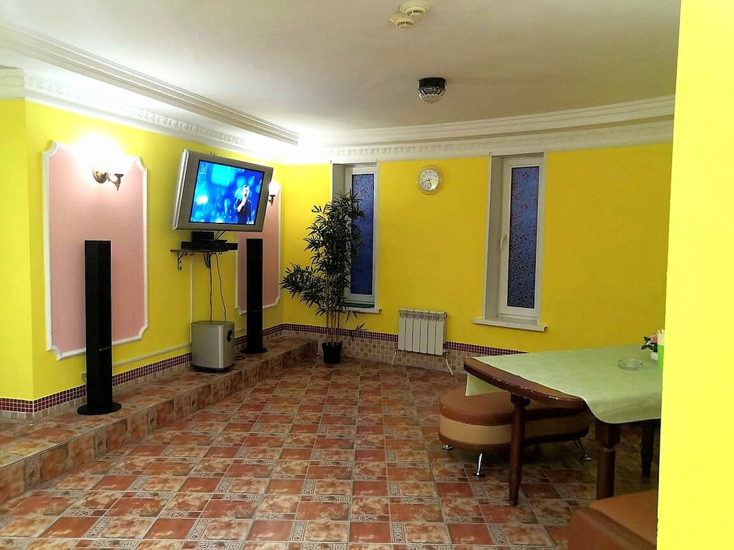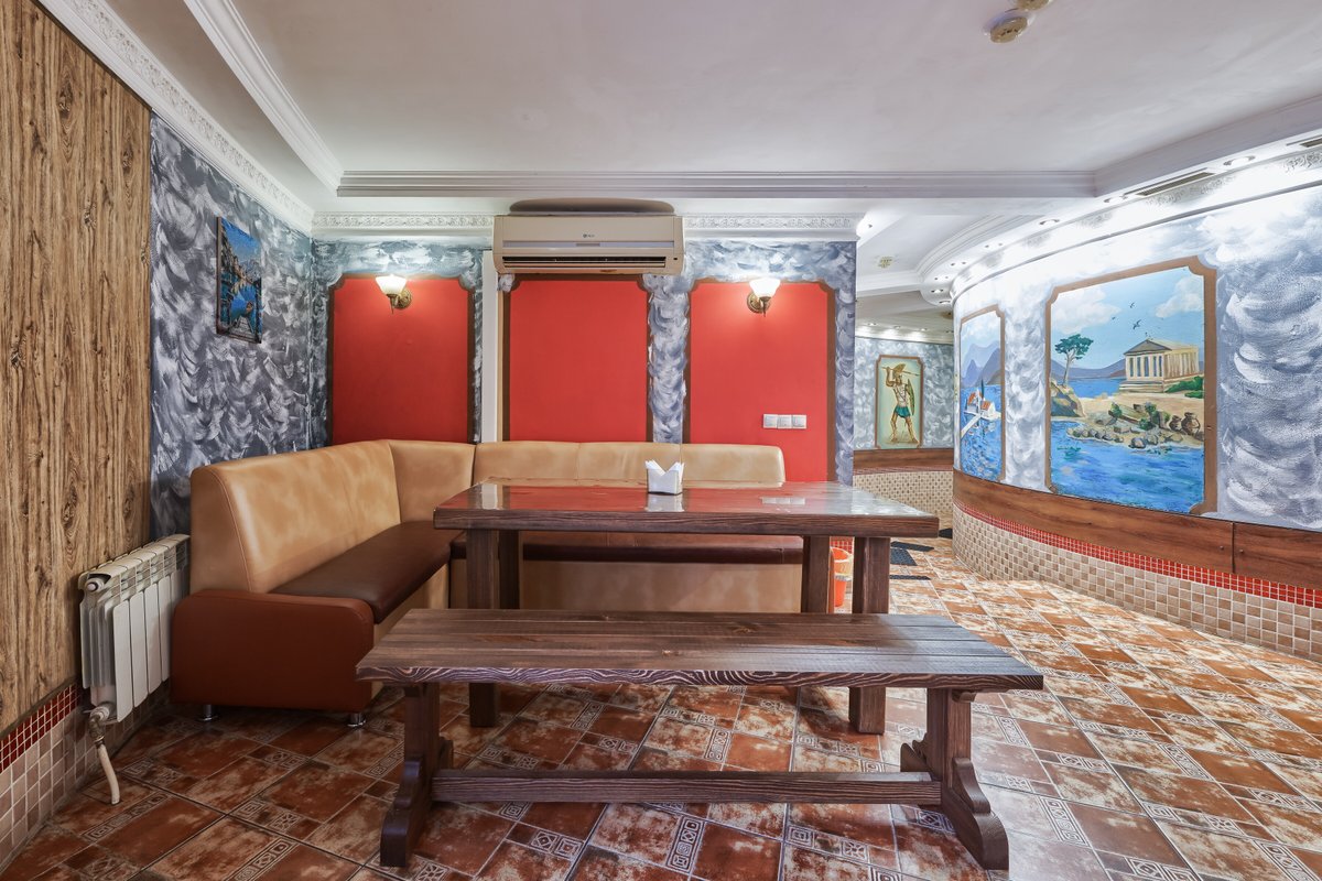 Не хочется в бассейн? Не проблема! Вместо этого можно посидеть в нашей комнате отдыха. Мы постарались создать здесь комфортный, стильный интерьер из максимально натуральных, экологичных материалов, выбрать мебель, которая будет одновременно удобной и приятной глазу. Надеемся, что он придется вам по душе! Для создания настроения у нас есть караоке. Также у нас работает бар, а если нужно, вы можете прийти и с собственной едой - мы не против! Только не забывайте, что плотная трапеза непосредственно перед посещением парной - это не самая хорошая идея, согласно мнению докторов. А вот после парной она совсем не повредит!